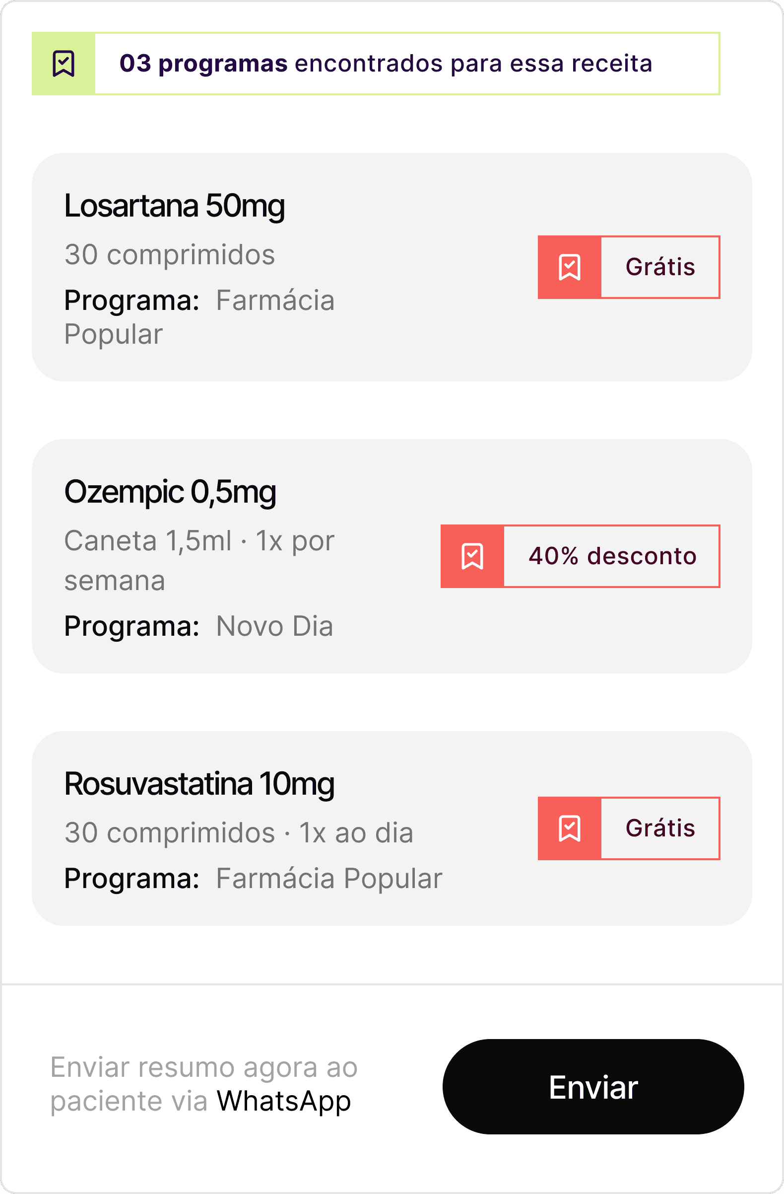 Se tiver pela nossa solução, você clica em "enviar". O paciente recebe no WhatsApp um resumo dos programas, endereço das farmácias e o que levar. Sem app, sem cadastro para o paciente.
